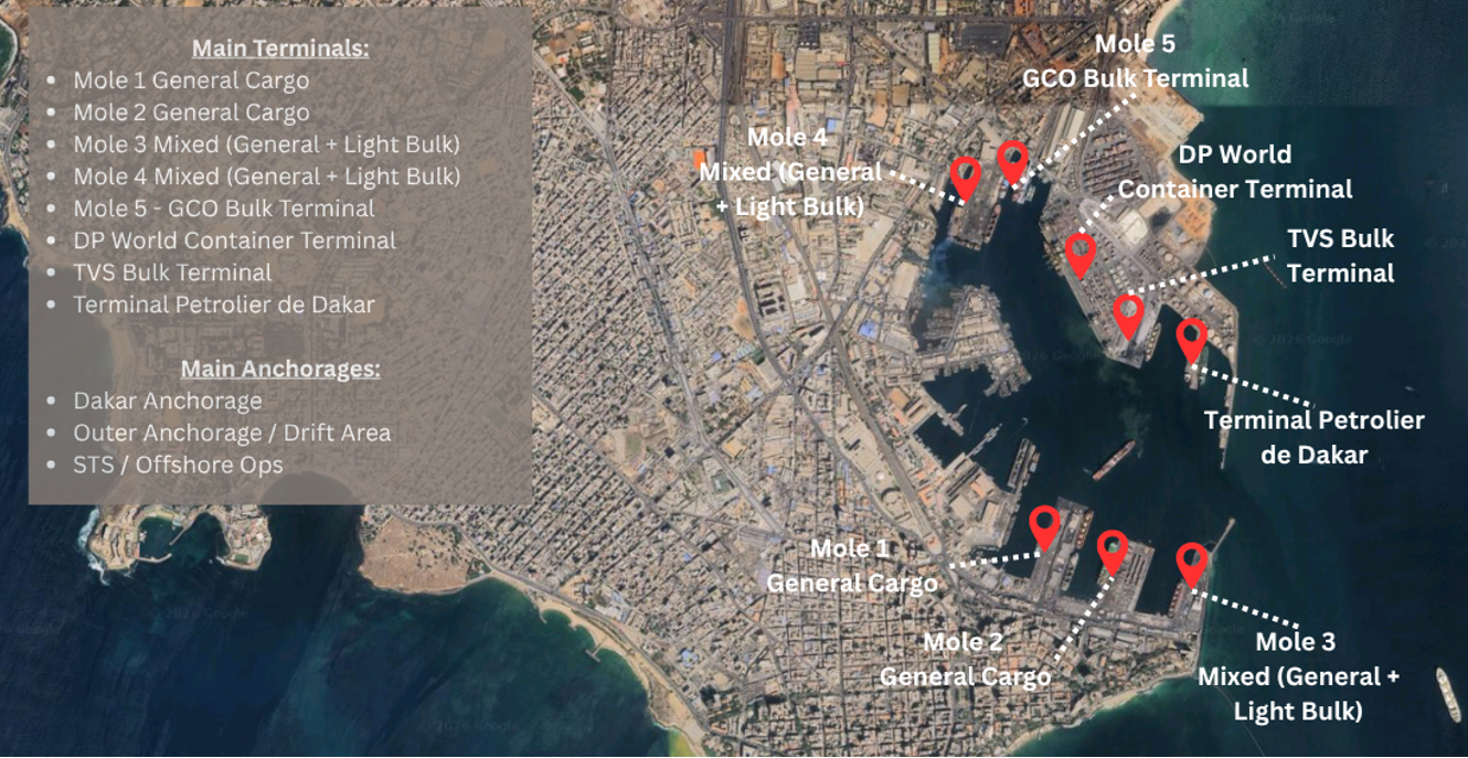 Deliveries arranged among others at Dakar anchorage, Mole 1 & 2 General Cargo Berths, DP World Container Terminal and TVS Bulk Terminal and Terminal Petrolier de Dakar