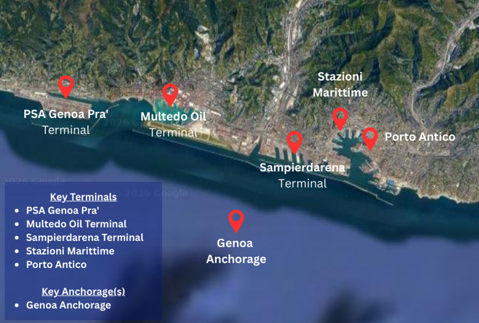 Marine lubricants in Genoa are supplied at anchorage and major terminals such as PSA Container Pra', Multedo Oil Terminal and Sampierdarena Terminal